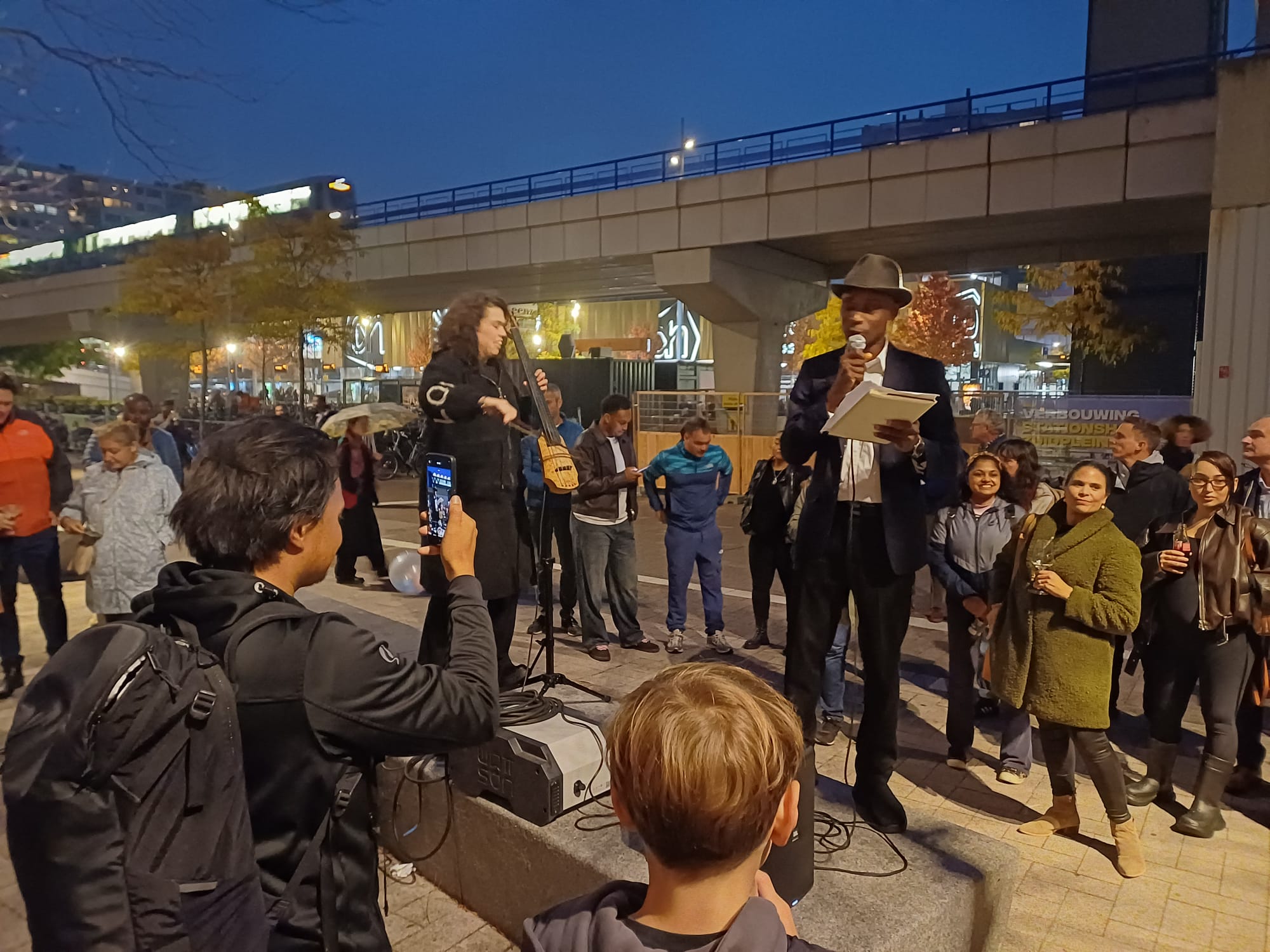 Binnen in de zaal zorgden schrijver en dichter Ishmail Kamara (Sierra Leone) en celliste Martha Gonzalez (Spanje) voor een kippenvelmoment. Hun gezamenlijke optreden was een krachtige vertaling van de culturele kruisbestuiving waar Faces of Rotterdam voor staat. Beiden maken zelf ook deel uit van het project.